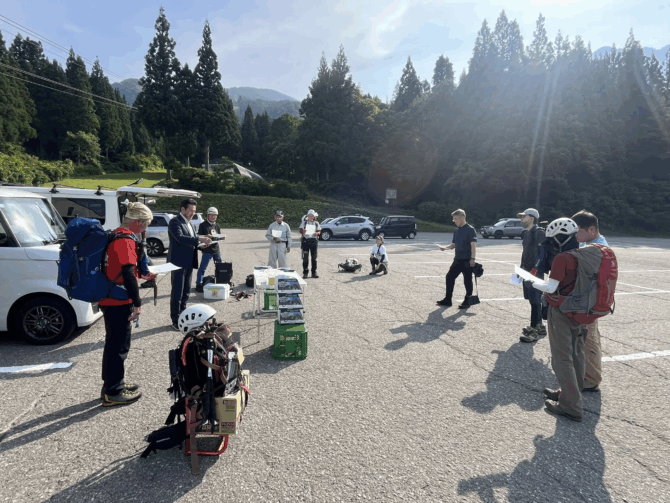 「霊峰八海山を囲む会」の皆さんの登山道整備出発前に、ご挨拶と改築予定の千本檜小屋のトイレの進捗状況をお話しさせていただきました