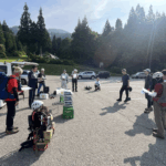 「霊峰八海山を囲む会」の皆さんの登山道整備出発前に、ご挨拶と改築予定の千本檜小屋のトイレの進捗状況をお話しさせていただきました